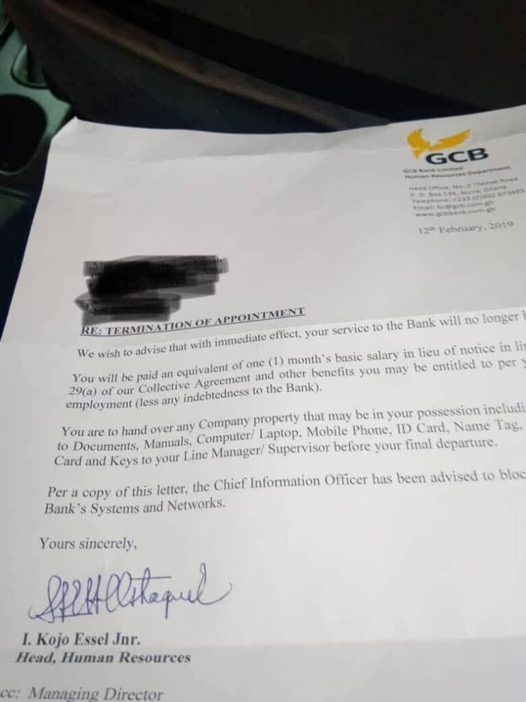 In a public post, Gunu questioned Mr. Nkansah’s credibility and pointed to a termination letter dated February 12, 2019, issued by the Human Resources Department of GCB Bank to an employee, as clear evidence that dismissals did occur under the NPP government.