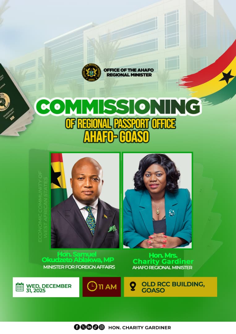 The commissioning ceremony, scheduled for Wednesday, December 31, 2025, will be hosted by the Ahafo Regional Minister, Hon. Mrs. Charity Gardiner, who is expected to receive the Minister for Foreign Affairs and Regional Integration, Hon. Samuel Okudzeto Ablakwa, for the historic occasion in Goaso.